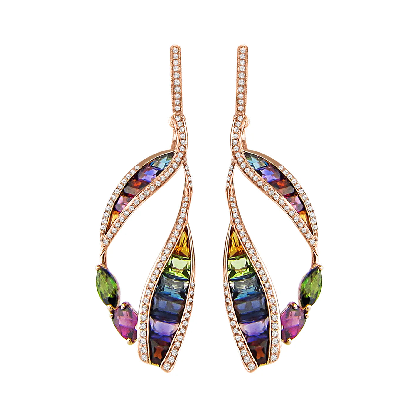 the earrings are set in 14kt Rose Gold and contain approximately 1.00ct of genuine Diamonds and 8.70ct combination of genuine multi color gemstones (Amethyst, Blue Topaz, Citrine, Green Tourmaline, Iolite, Peridot, and Rhodolite).